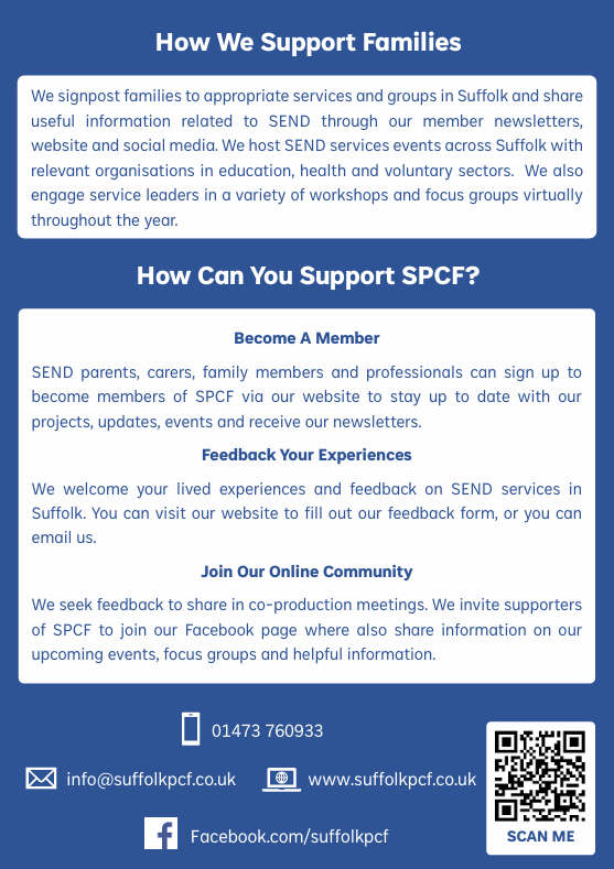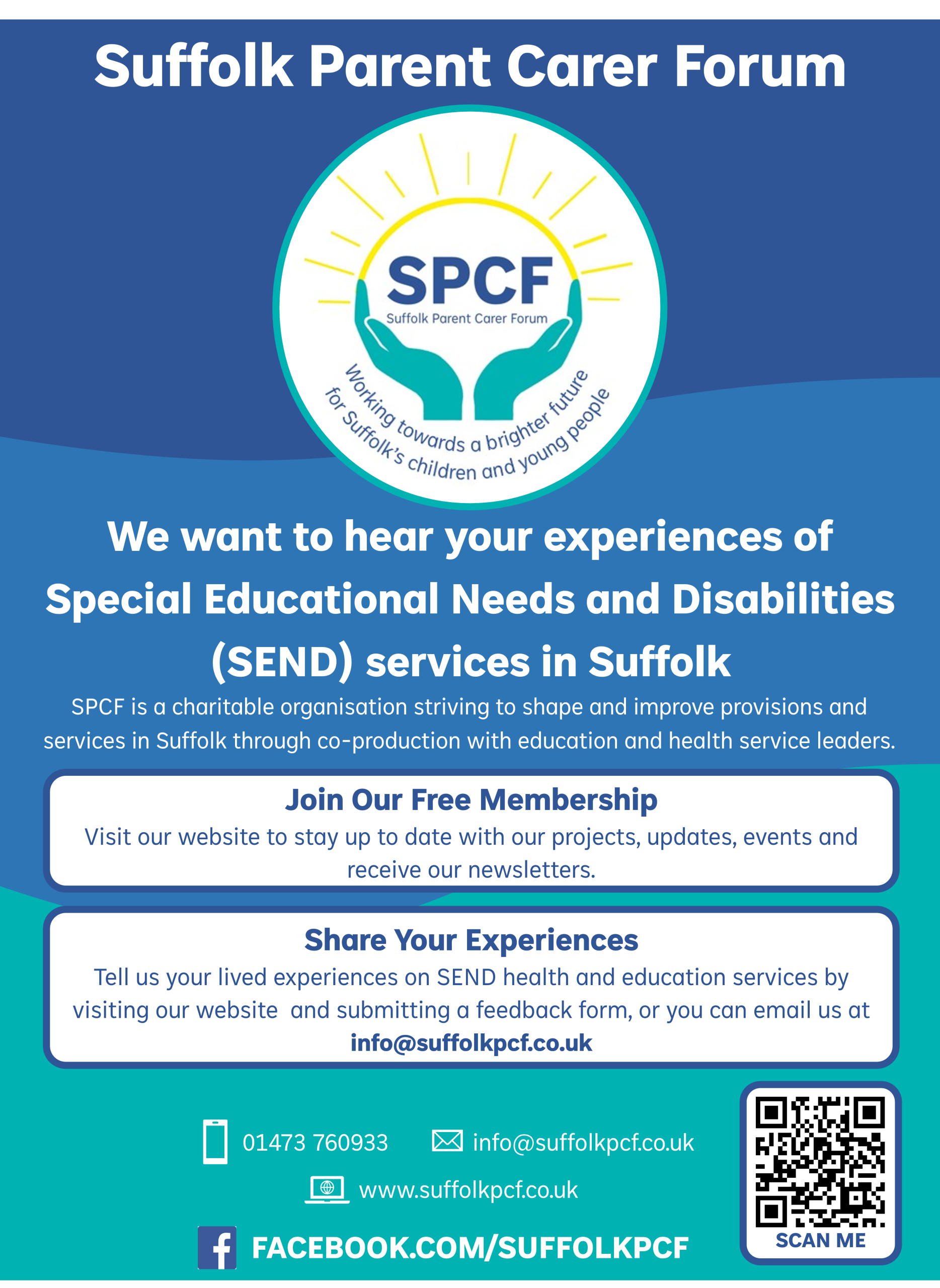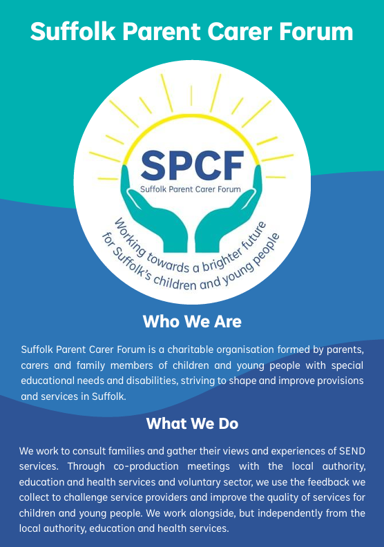 Below are virtual copies of the Suffolk Parent Carer Forum leaflets and our poster.